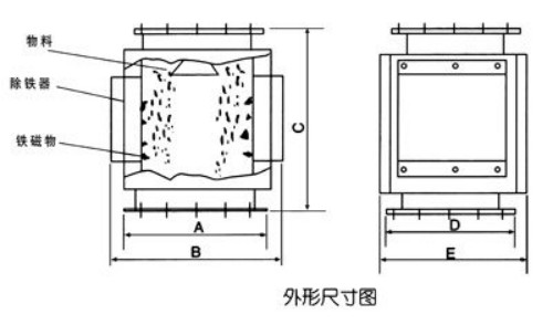 物料經(jīng)過本除鐵器時(shí),經(jīng)除鐵器中心分流板把物料分流到管道除鐵器的磁場(chǎng)覆蓋區(qū),鐵磁性物質(zhì)被吸附在管道壁上,清除鐵磁性物時(shí)打開側(cè)門,把鐵磁性物質(zhì)取出即可。